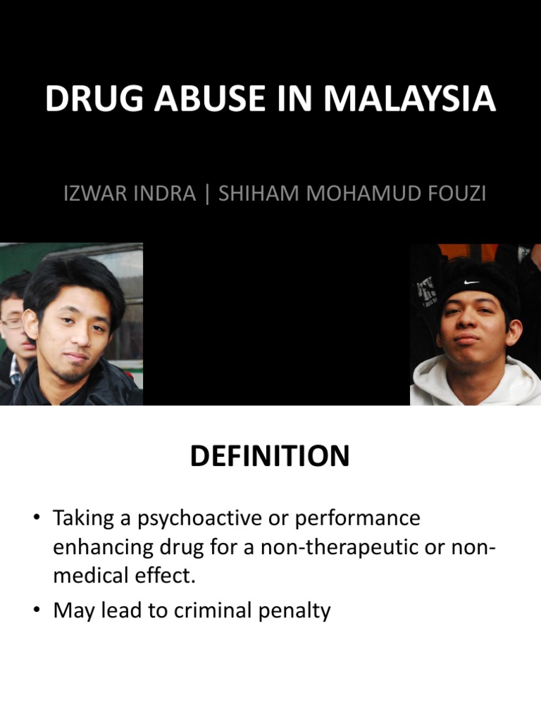 Drug abuse means use of a drug that is not for a medical purpose. There are studies that shows that the number of drug abuse in malaysia is increasing rapidly. Drug free malaysia mengucapkan jutaan terima kasih kepada semua yg terlibat dalam karya agung raya bersama. Drug abuse in malaysia introduction drug abuse is said to be a situation whereby one's dependence upon a drug is high. The number of registered drug users is about 250,000 in a 2008 report, and is expected to reach half a million by.