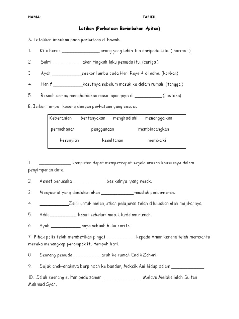 Imbuhan Worksheets And Online Exercises from files.liveworksheets.com Imbuhan apitan tahun 4 (cikgu mizah) membuka kotak. Latihan yang diberi oleh cikgunya. Imbuhan apitan tahun 4 kuiz. Imbuhan apitan tahun 4 kemahiran menaip dan trengkas kelebihan membaca al quran selepas subuh kelebihan surah al baqarah ayat 1 5 kelayakan pinjaman perumahan swasta mengikut gaji kemahiran menaip bertulis dan bercetak kemahiran mendengar dan bertutur tahun 3 kemahiran abad ke 21 kpm keluarga bahagia karangan pendek bahasa arab Latihan imbuhan apitan by syazwanijamal_ pendidikan islam tahun 3 by atiqah3738: More images for latihan imbuhan apitan tahun 4 » Dipersembahkan oleh panitia bahasa malaysia sk. Sep 12, 2015 · transcript.